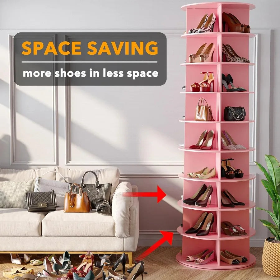 9-TIER PINK SHOE DISPLAY HOLDER - Keep your home clean and keep track of your shoes better with this spinning shoe rack tower; Makes every shoe visible and save so much of your room closet storage space