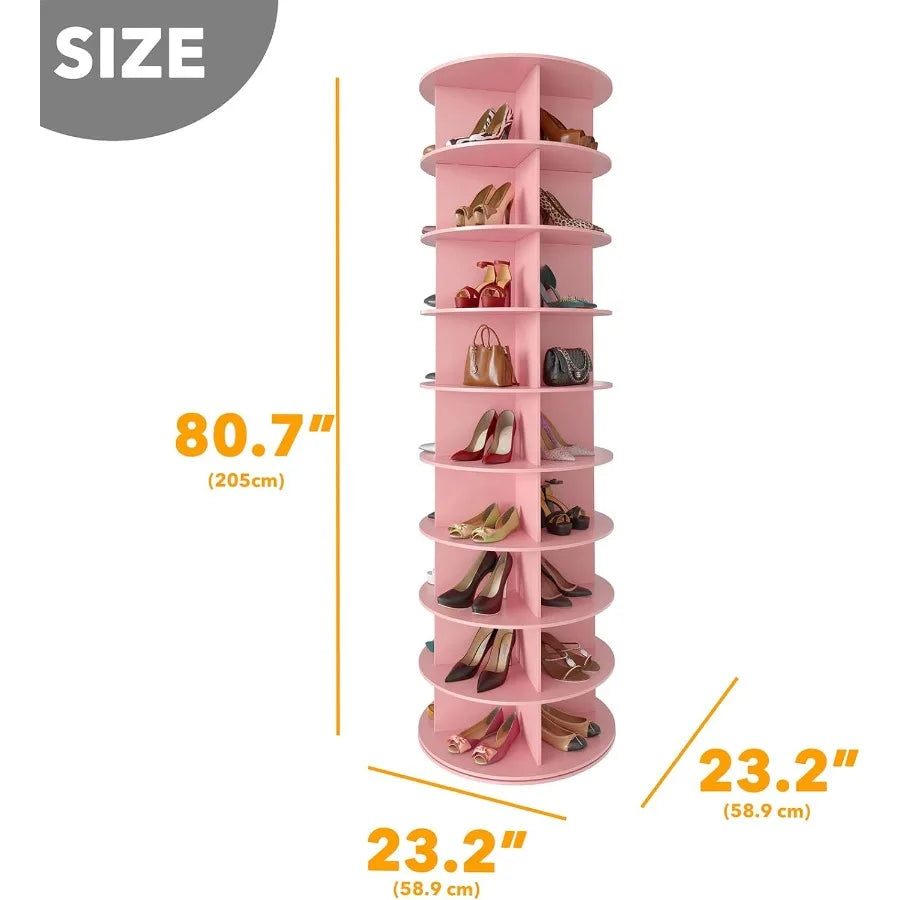 ORGANIZED AND BEAUTIFUL - Make your shoes neat and organized with this rotating shoe rack tower lazy susan; The space saving design can hold up many shoes or bags in a compact space; SIZE: 23.2"W x 23.2"D x 80.7"H