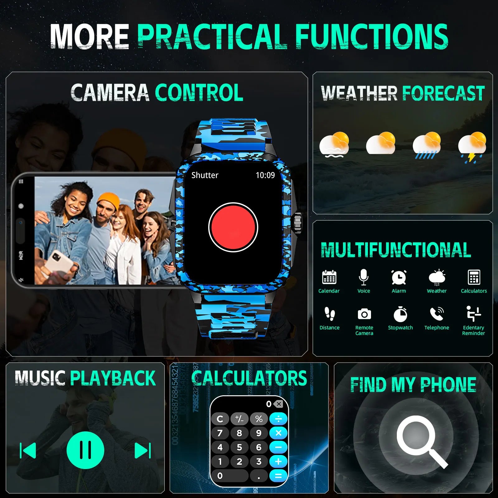 LaNikar Smart Watch 3ATM Waterproof Men 1.96" KT71 Fitness Tracker Heart Rate Bluetooth Call Camouflage Color Original Design