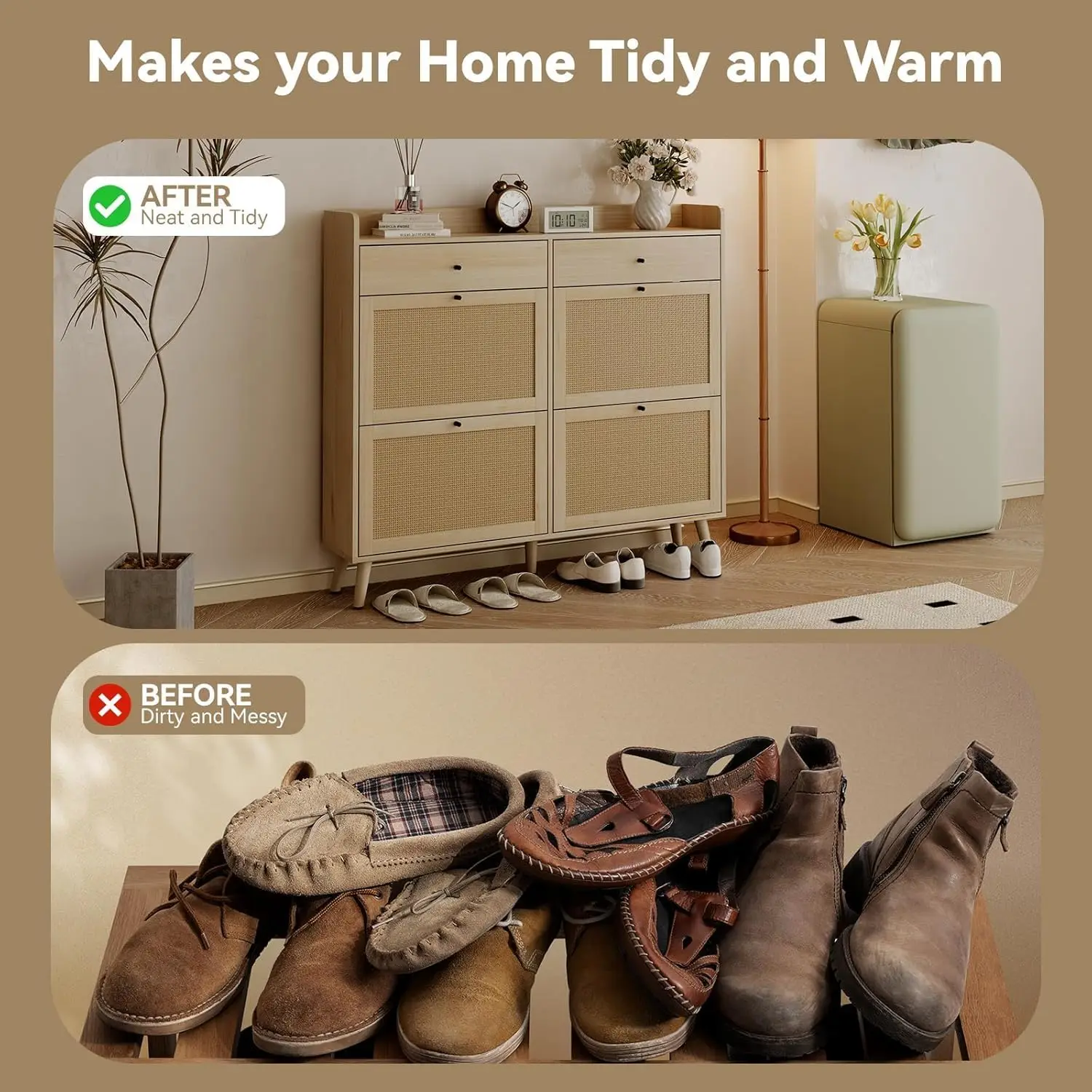 【Rattan Design Narrow Shoe Cabinet】- This shoe cabinet features elegant hand-woven rattan doors that elevate its aesthetic charm. The thoughtful design promotes a more inviting living space while effectively keeping dust off your shoes and preventing pets from accessing them. With its narrow profile, this cabinet is an ideal solution for small apartments, dormitories, or tight hallways, offering both functionality and style in a compact form. Enjoy a blend of sustainability and sophistication in your home.