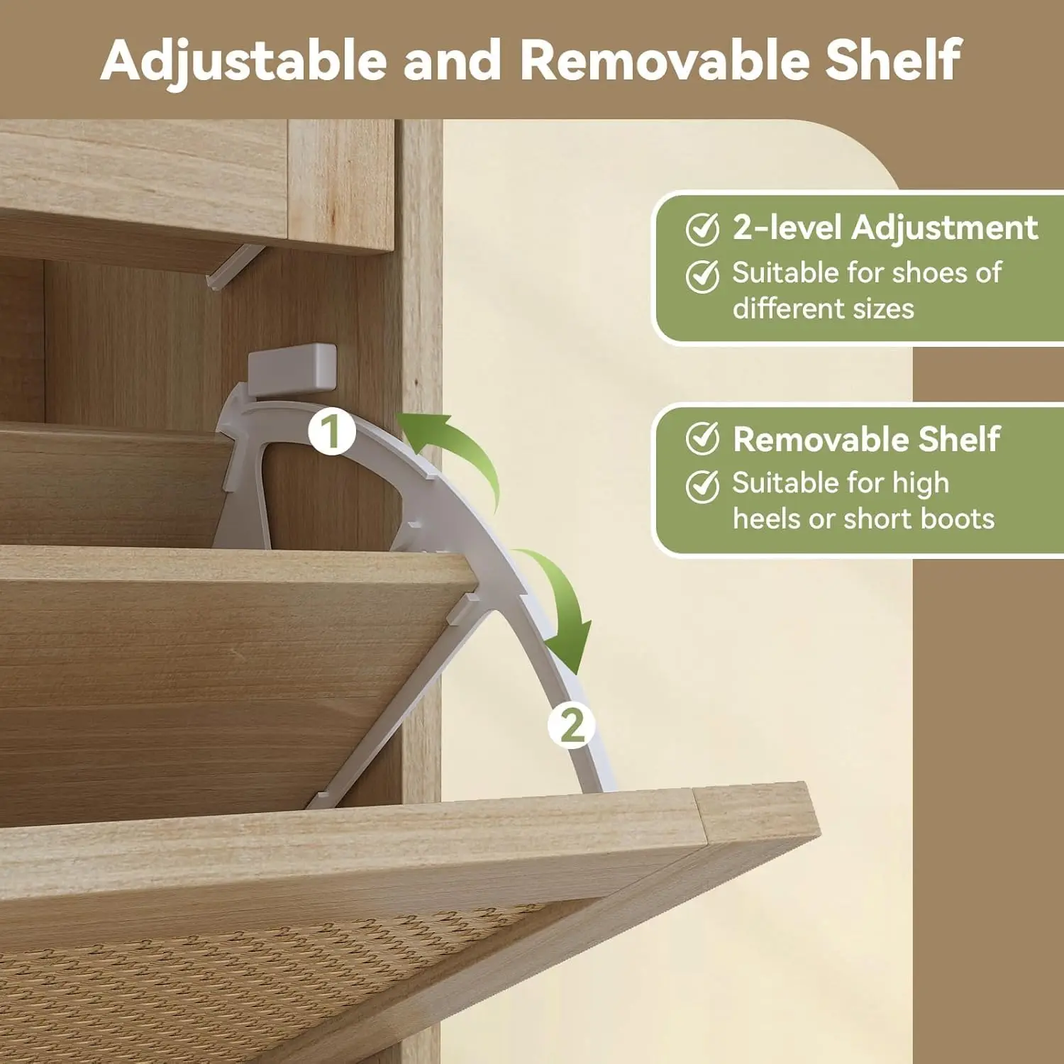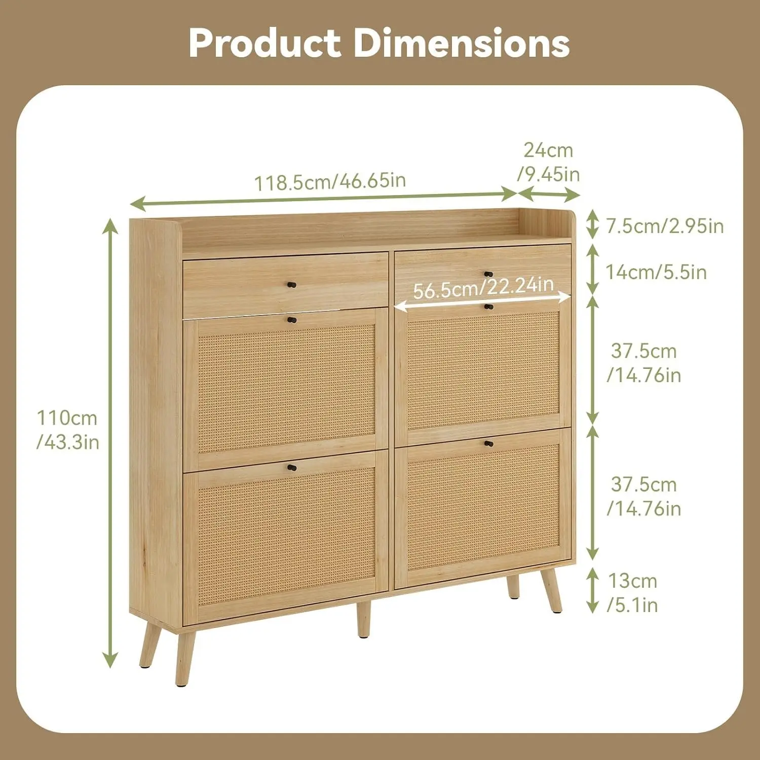 【Enhanced Storage for Personal Items】- Elevate your entryway shoe storage with a spacious top platform perfect for displaying photo frames, wallets, or decorative accents. Additionally, the two built-in slide drawers provide convenient storage for essentials like cards, keys, shoe polish, and brushes, keeping everything organized and easily accessible. Resting on four sturdy solid wood legs, this wooden shoe storage cabinet offers durability and stability, making it a dependable addition to your home.